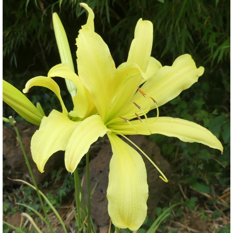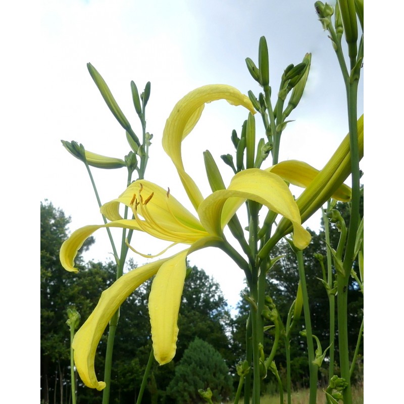 Obtention maison issu d'altissima x 'Lady Fingers'. Spider produisant un abondante quantité de grandes fleurs parfumées, jaune tendre, haut sur tige.