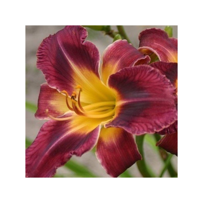 Grandes fleurs étoilées, œil bordeaux foncé, cœur jaune orange.