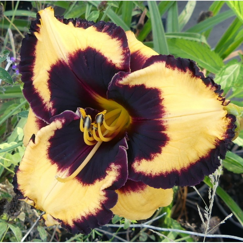 Fleurs rondes et charnues beige ocre fortement rehaussé par large halo et bordure bordeaux foncé. Très remontant.