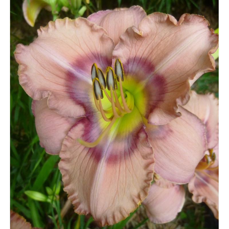 Fleurs assez rondes, rose tendre, halo en dégradé de mauve et lie de vin, cœur chartreuse.