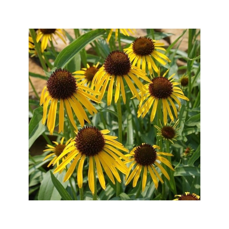 Vivace érigée et touffue à floraison estivale, en capitules jaunes d'or au cone centrale marron. Feuillage lancéolé, vert foncé.