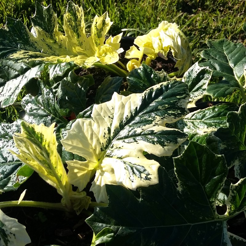 Originaire du bassin méditerranéen. Variante de l'acanthe à feuilles molles à feuillage très découpé, vert panaché de blanc crème, fleurs blanches infusées de rose .