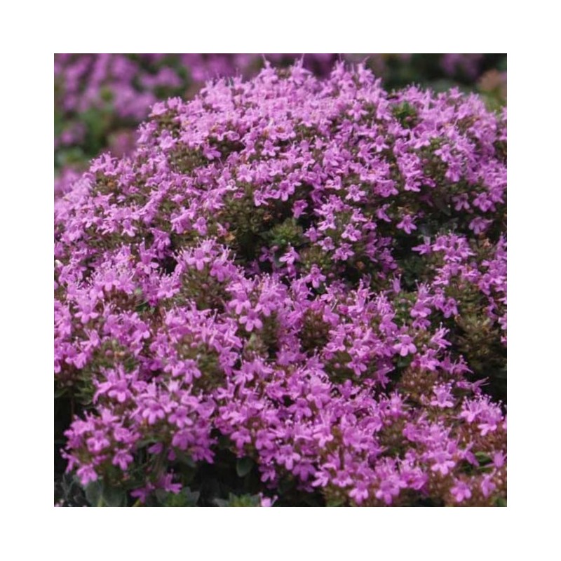 Thym rampant (non aromatique!), formant une couverture vraiment rase et dense de petites feuilles persistantes, vert foncé. Floraison estivale abondante, rose pourpre, dépassant à peine le feuillage. Convient pour milieu rocailleux, sec, dallage, gazons peu piétinés.