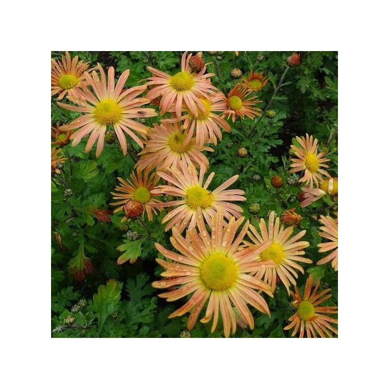 Chrysanthème rustique poussant en touffe évasé, fleurs simples, jaune ocre et cœur jaune d'or. Sa floraison débute en milieu d'été et se prolonge jusqu'en début d'automne. Son feuillage, vert pomme, est profondément découpé.