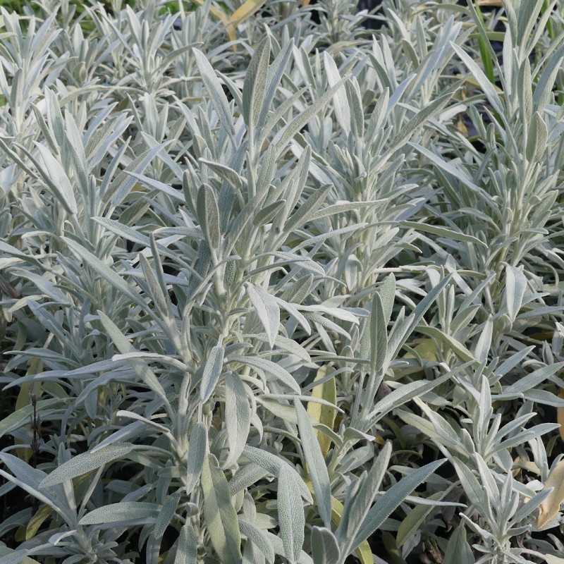Sauge officinale à feuilles étroites, blanc argenté, délicatement parfumé. Vivace ornementale, culinaire et officinale. Mellifère et résistant à la sécheresse. Floraison en épis bleu ciel, fin printemps-début d'été.