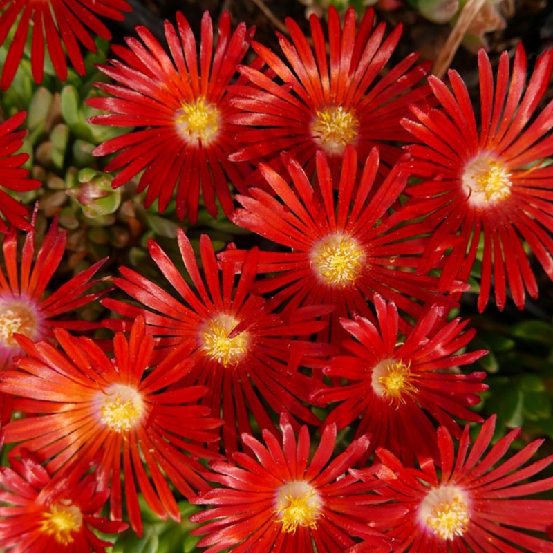 Pourpier vivace. Couvre sol vigoureux et très florifère s'accommodant de de sols pauvres et secs. Le cultivar 'Nani Forssman' se couvre dès fin de printemps jusqu'en automne de fleurs étoilées, rouge paprika vif.