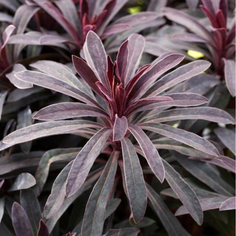 Cultivar à port compact et arrondi, feuillage persistant rouge pourpre saturé. Floraison printanière lumineuse, jaune chartreuse. Bonne résistance à la sécheresse.