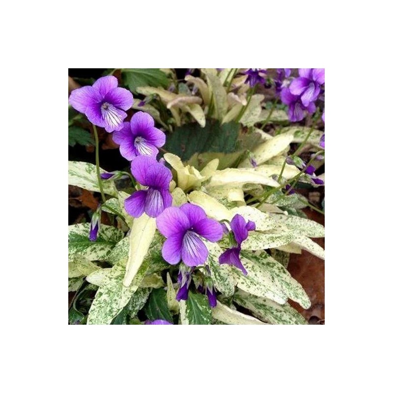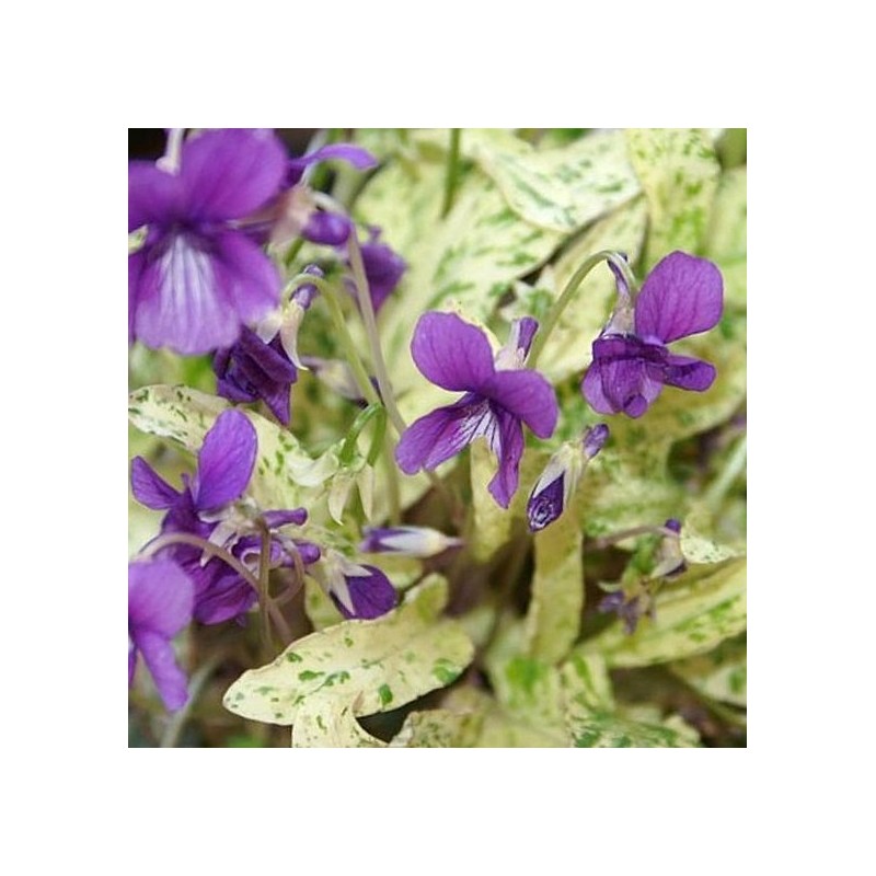 Violette de Mandchourie. Violette à floraison bleu violet. feuillage originale, lanciforme et panaché par touche irrégulière de blanc crème et rose.