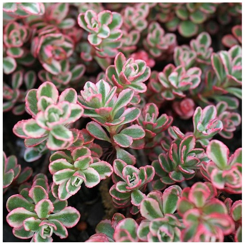 Sedum couvre sol bas, à feuillage panaché, semi persistant, vert, blanc et rose. Rustique et résistant à la sécheresse.