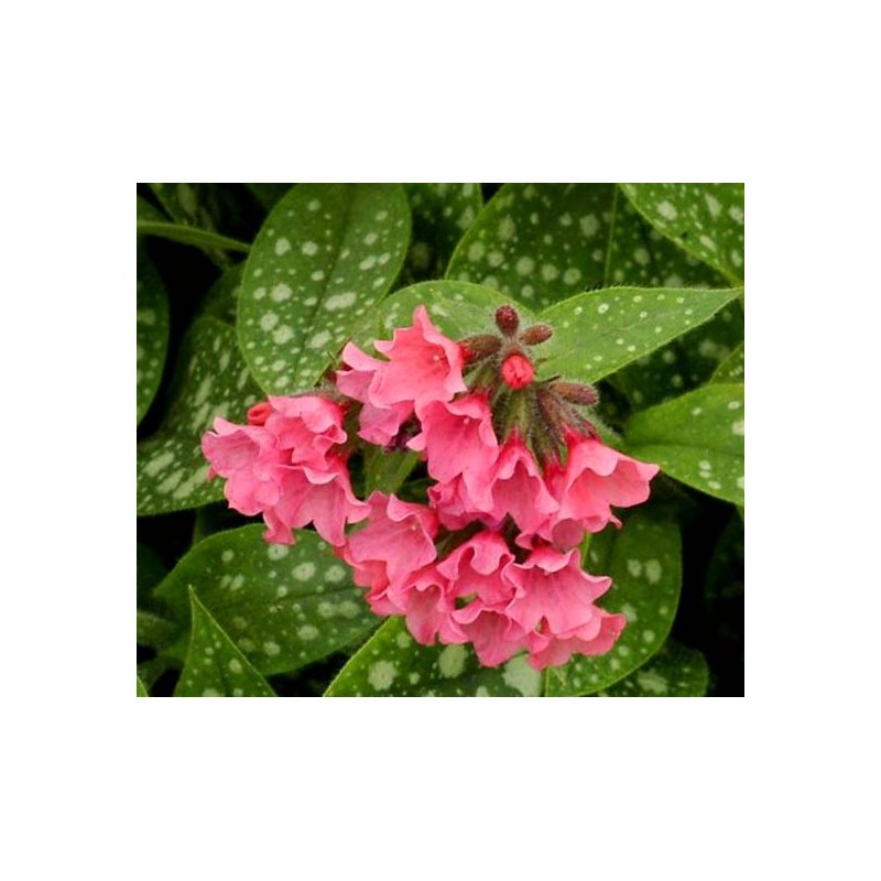 Cultivar à fleurs rose saumon. Jolie feuillage lancéolé, vert pomme maculé de blanc argenté.