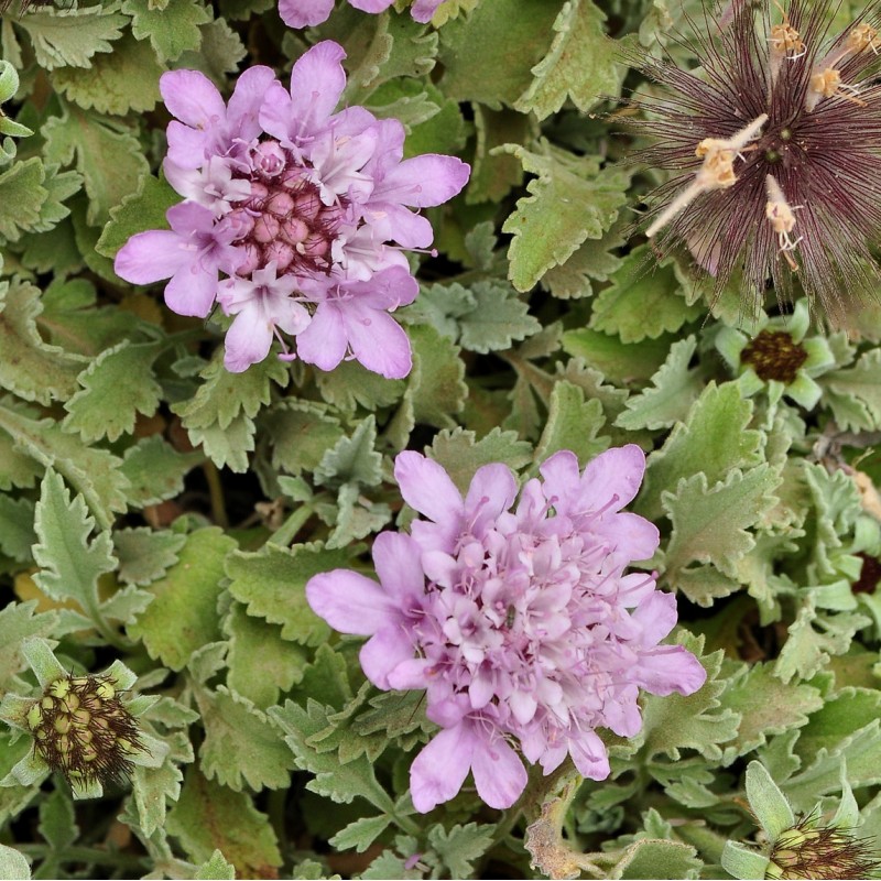 Plante alpine originaire des Balkans, poussant en coussin compact, feuillage crénelé, gris vert, feutré. Longue floraison estivale en capitules rose mauve tendre. Convient pour milieu rocailleux, bacs et pots.