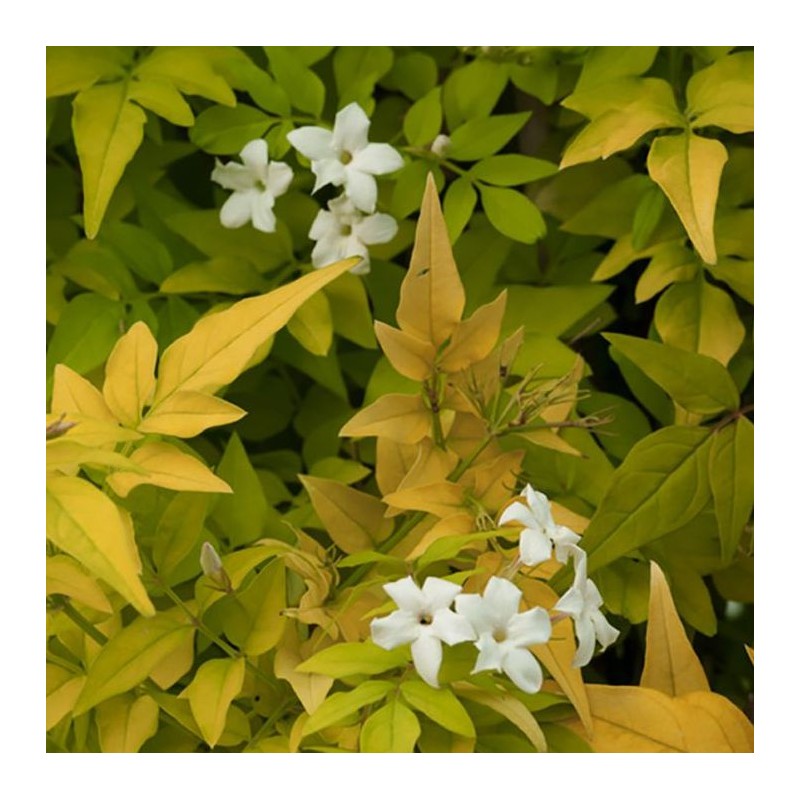 Jasmin officinal, attrayant pour son joli feuillage doré, semi persistant, une vivace liane lumineuse muni de petites fleurs étoilées, blanches, très parfumées, durant tout l'été. Produit une belle luminosité en situation partiellement ombragée.