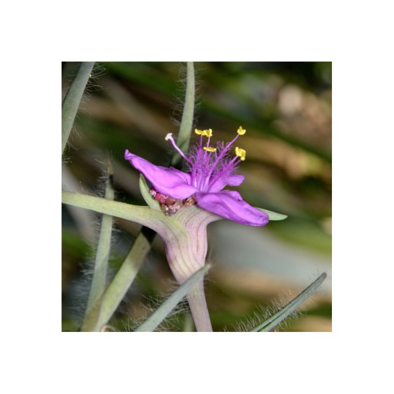 Ephémère hirsute. Vivace à port dressé, feuilles ovales et tiges charnues, gris vert, pubescentes.